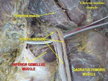 ภาพประกอบ แสดงสภาพแวดล้อมทางกายวิภาคของเส้นประสาทไซอะติกผ่านกล้ามเนื้อมัดต่างๆในร่างกายมนุษย์จริง