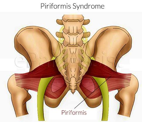 สำหรับกล้ามเนื้อที่พบบ่อยว่ามีการหนีบทับเส้นประสาทส่วนขา และสับสนกับโรคของหมอนรองกระดูกทับเส้นได้บ่อยๆ คือ กล้ามเนื้อที่มีชื่อว่า พิริฟอร์มิส (Piriformis) จึงมีผู้ใช้ชื่อโรคกล้ามเนื้อสะโพกหนีบเส้นประสาทขาว่าพิริฟอร์มิสซินโดรม (Piriformis Syndrome) ผู้ป่วยจะมีอาการปวดร้าวตามขาเรื้อรัง และมีอาการปวดสะโพกบริเวณที่นั่งทับ อาจจะมีอาการเล็กน้อย จนถึงขั้นรุนแรง และเดินไม่ได้ ผู้ป่วยบางรายได้รับการทำ MRI หวังว่าจะพบกระดูกทับเส้น แต่ผลพบว่ากระดูกสันหลังปกติทั้งหมด ทำให้ไม่สามารถวินิจฉัยได้ว่าเกิดจากสาเหตุอะไร แต่ที่โชคร้ายกว่านั้นคือ ผู้ป่วยบางรายผล MRI มีหมอนรองกระดูกเสื่อมหรือผิดปกติเพียงเล็กน้อยแต่ด้วยความปวด ทำให้ผู้ป่วยได้รับการผ่าตัดที่กระดูกสันหลังไป แต่ไม่หายปวด!! ซึ่งเป็นเพราะมีสาเหตุจากกล้ามเนื้อหนีบทับเส้นประสาทนี้ แฝงอยู่แต่เดิมนั่นเอง