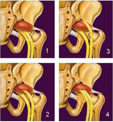 ภาพประกอบ แสดงการระคายหรือหนีบรัดเส้นประสาทของกล้ามเนื้อพิริฟอร์มิสหรือสลักเพชร ซึ่งตำแหน่งการพาดผ่านของเส้นประสาทมีความแตกต่างในแต่ละบุคคล