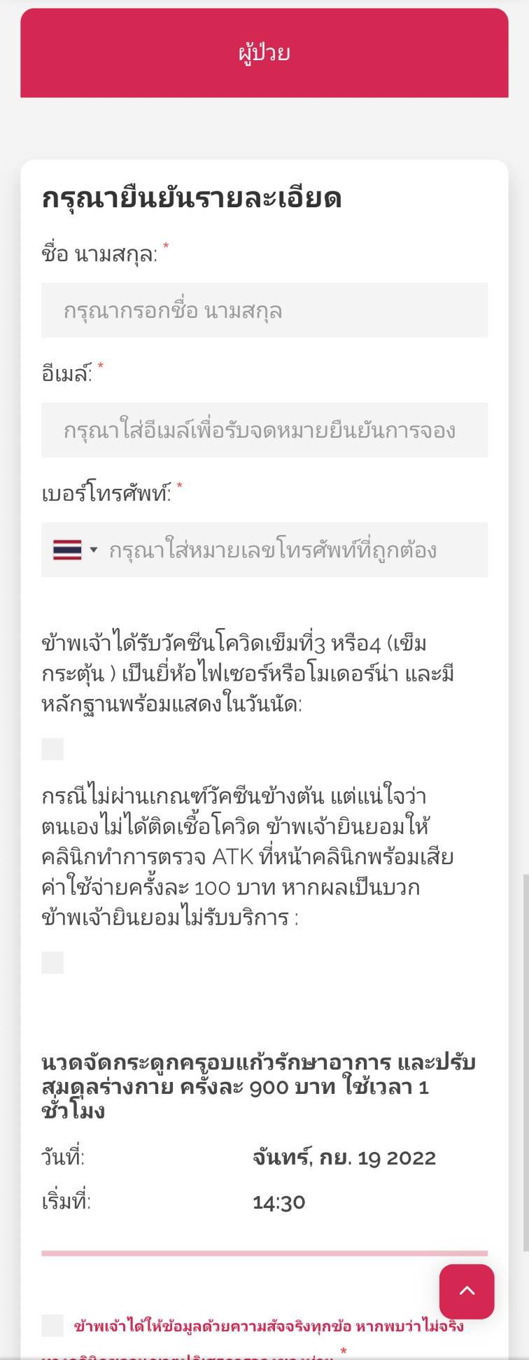 - สำหรับผู้ที่ไม่ผ่านเกณฑ์วัคซีนข้างต้น แต่มั่นใจว่าตนเองไม่ได้ติดเชื้อโควิด สามารถทำการจองคิวได้ แต่ต้องให้ทางเจ้าหน้าที่คลินิกตรวจ ATK ก่อนเข้าคลินิก โดยมีค่าตรวจ 100 บาท ในกรณีที่ผลเป็นบวกหรือพบเชื้อผู้ป่วยจะไม่สามารถเข้ารับบริการได้