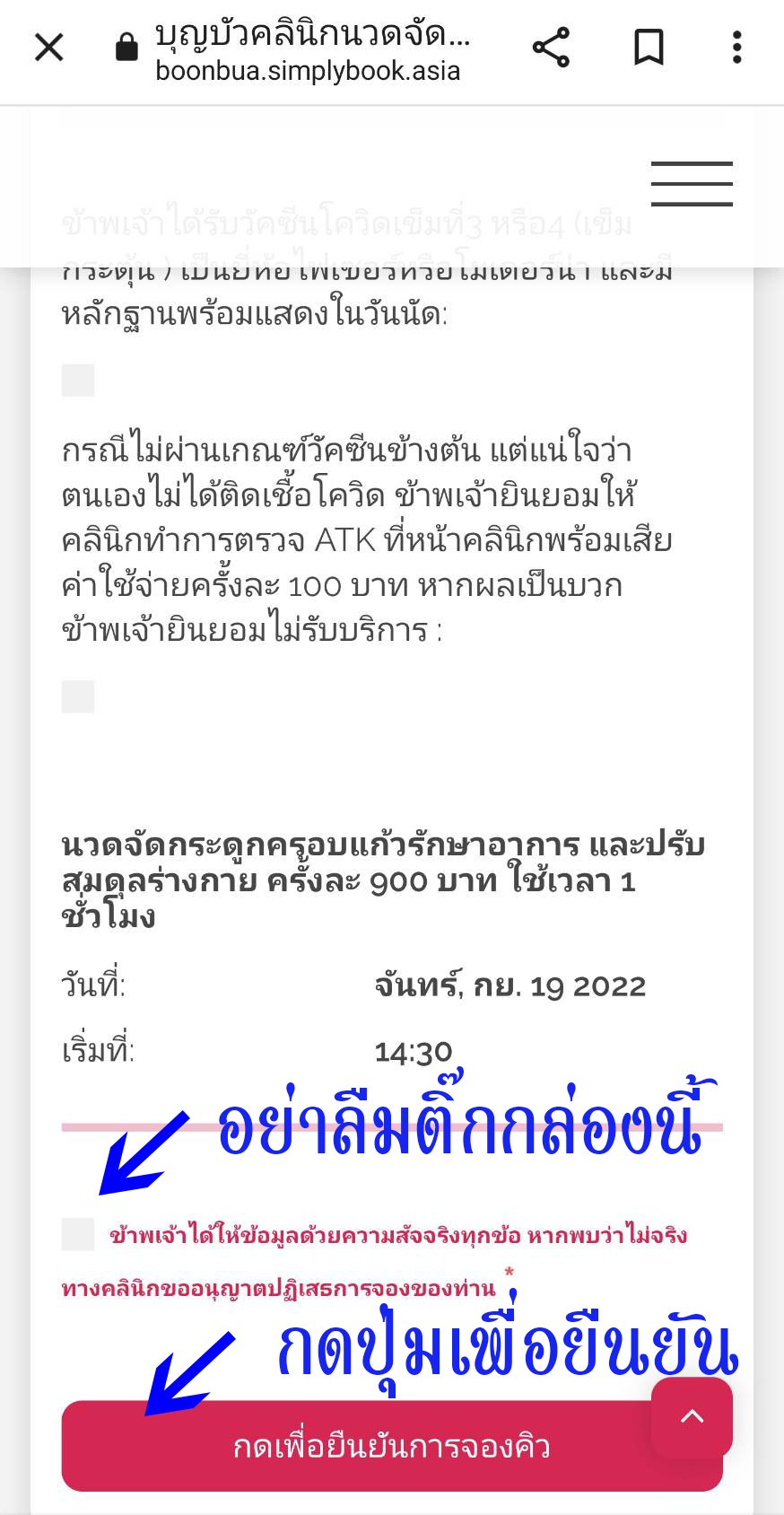 - เมื่อผู้ป่วยยินยอมและเห็นว่าตนเองพร้อมจะทำการนัดหมายล่วงหน้ากับทางคลินิก สามารถเข้าไปที่โปรแกรมจองคิวของเรา โดยคลิกที่ https://boonbua.simplybook.asia/v2/ ทำตามขั้นตอนตามภาพข้างล่างได้เลย