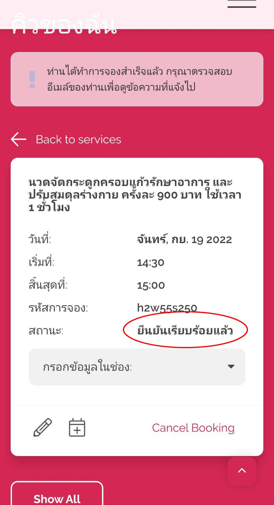 - เมื่อลงทะเบียนกรอกข้อมูลในระบบเสร็จแล้ว ท่านจะได้รับข้อความยืนยันการจองสำเร็จผ่านทาง SMS และ อีเมล์ ท่านสามารถมาตามวันเวลานัดหมายได้