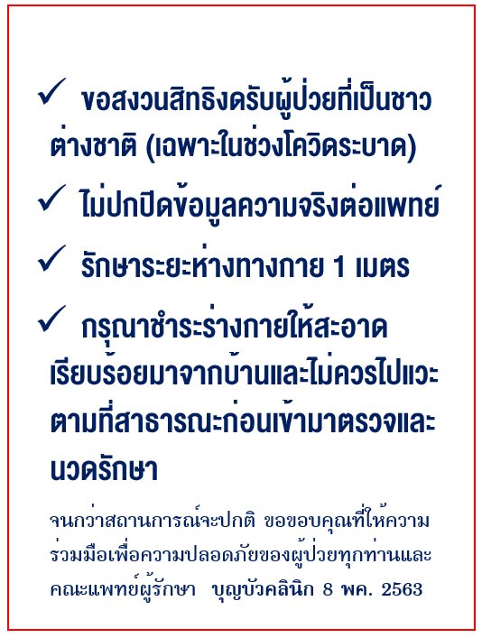 - รับเฉพาะผู้ป่วยที่จองคิวในระบบออนไลน์ของเราเท่านั้น